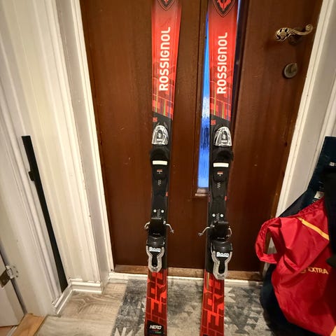 Rossignol P-Corv alpinski med bindinger. Skiene har en flerfarget design med svart, hvit, blå og grønn farge. Egnet for alpint bruk.