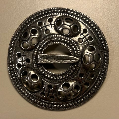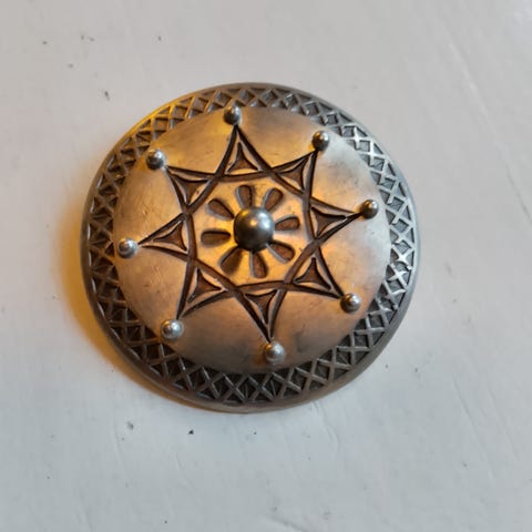 Veldig fin brosje i tinn (pewter) av Rolf Buodd (design). Merket "Norsk håndarbeide".