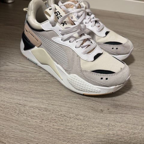 Puma RS-X Reinvent i fargen "White-Natural Vachetta str. 38,5 (ubrukte) selges til kr. 800 (kjøpspris var kr. 1200). Kjøpt for 2 år siden, har kun stått lagret og er ikke brukt. Fremstår derfor som nyinnkjøpte. Selges da jeg har flere av samme modell. MERK: Jeg bruker str. 38, men måtte opp en halv størrelse i denne modellen! Flott sneaker, svært komfortabel, klemmer ikke foran siden den har litt bredde. Fin både til kjole og jeans. Overdelen er av mesh, semsket og syntetisk skinn. Lett PU mellomsåle, og yttersåle av gummi. Det er "pull tab" øverst på baksiden av hælkappen. Sender gjerne hvis mottaker betaler frakt (ikke FiksFerdig).