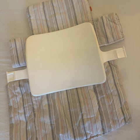 Stokke høy barnestol med avtakbart brett og polstret setepute. Passer for barn og gir støtte under måltider og aktiviteter ved bordet.