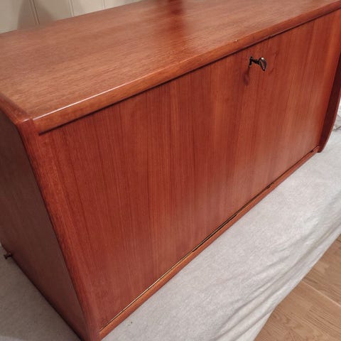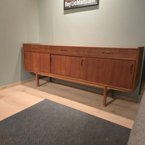 Selges etter flytting da vi har fått plass til en større reol og dessverre må bytte ut denne. Veldig fin vintage variant av vegghengt type Ergo De Luxe reol fra Blindheim møbler.