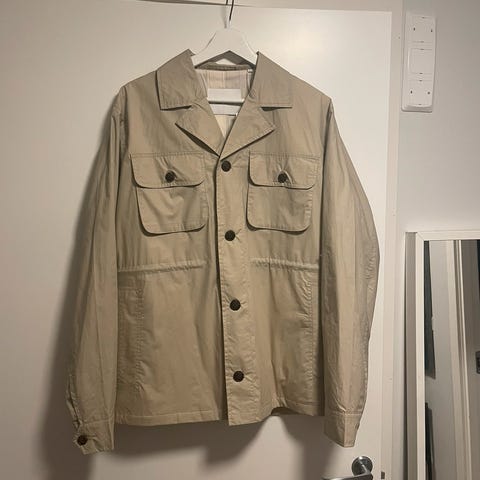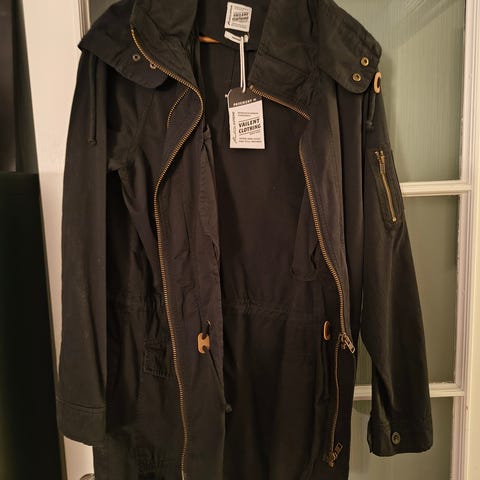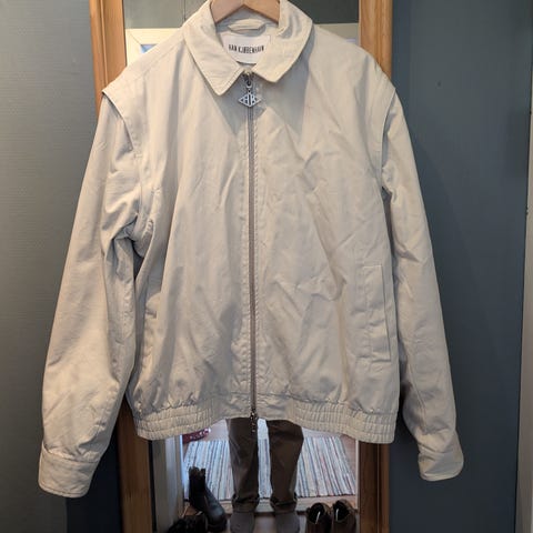 Vailent jakke i størrelse M. Jakken har en beige farge og er designet for menn. Den har glidelås foran og lommer på sidene.
