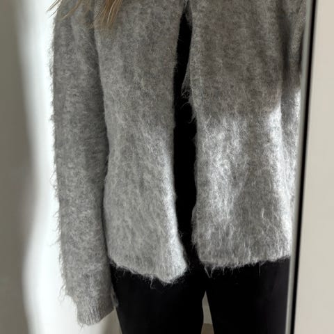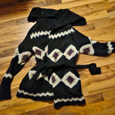 Bik Bok cardigan i størrelse M for kvinner. Flerfarget hvit brun og svartdesign laget av en blanding av mohairull, akryl og nylon. Ull jakke genser. Cardiganen har belte i livet og lang erme. Fin å bruke om vinteren. Se gjerne mine andre annonser