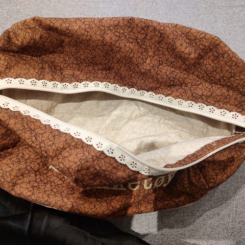 Ubrukt blåmønstret strikkemappe med sløyfe på, selges.