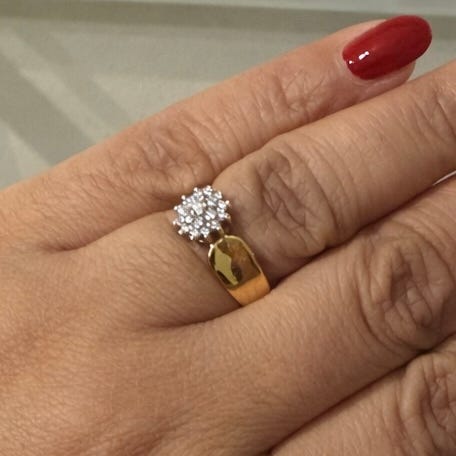 Alliansering i hvitt gull stemplet 585, med 5 diamanter, til sammen 0,15ct. Vekt 2,23g. Str 55. Assurert til 10500kr