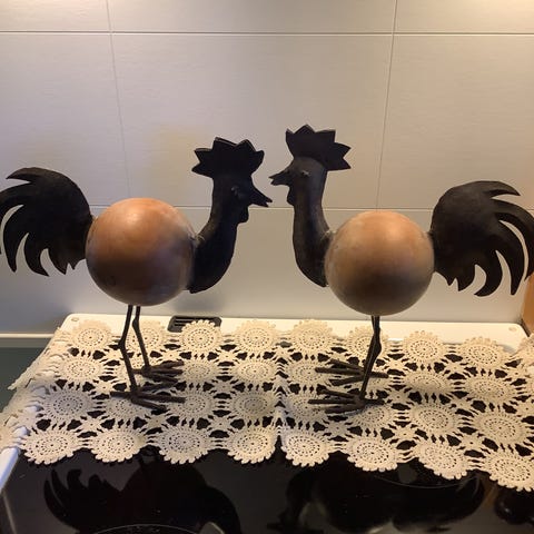Laget av metall, med enkelte merker i metallet etter produksjon. Høyde ca 37,5 cm, bredde ca 41,5 cm.