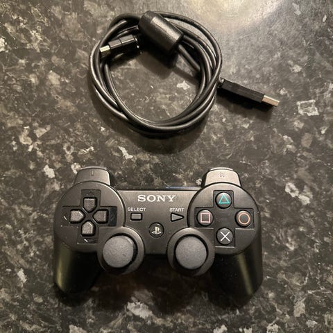 Sony PlayStation 3 trådløs kontroller i svart farge. Kontrolleren har standard knapper og analoge styrespaker, og kobles trådløst til PlayStation 3-konsollen.
