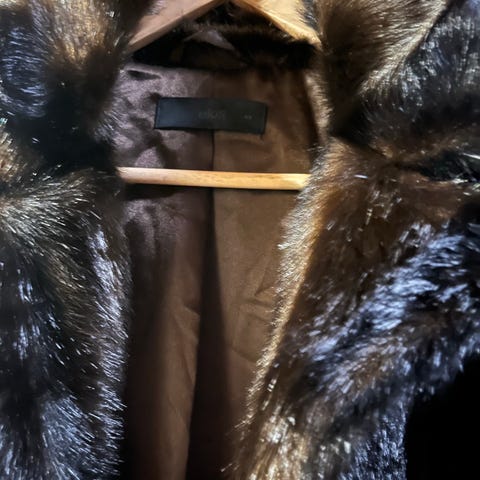 Denne ponchoen kan brukes begge veier, både med det svarte ut eller med leopardmønster. Nydelige detaljer med blant annet frynser. Det står ingen størrelse i den, men tipper den passer fra L-XL. Det er magnetknapper som gjør den lett å ta og av.