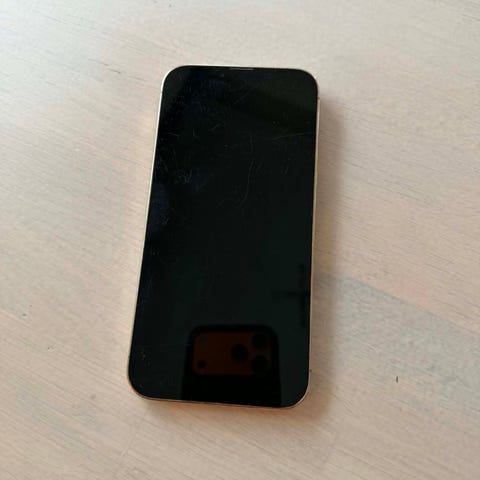 Apple iPhone 13 Pro Max mobiltelefon med 128 GB lagringskapasitet. Telefonen har ingen skader på skjerm verken foran eller bak. Telefonen har noen bruksmerker rundt kantene. Det ligger støv i høytalerne så lyden er lavere enn vanlig, men dette kan løses med å fjerne støv.