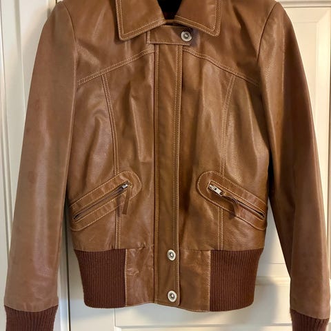 Skinnjakke, ekte saue-skinn, pent brukt. Størrelse «16 år» men tilsvarer størrelse S/M. Følger med skinnhansker.