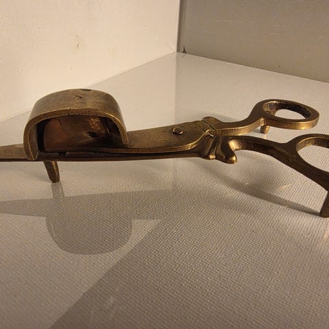 Dette er et autentisk husholdningsredskap fra stearinlysets epoke, brukt til trygg slukking av flamme. I dag er slike eksemplarer ettertraktede samlerobjekter og populære som dekor i klassiske og historiske interiører.