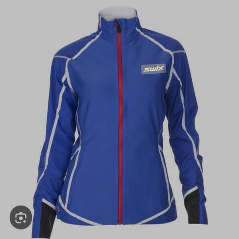 Swix treningsjakke for dame i størrelse M, med fargene rød og marineblå. Jakken har hel glidelås og er laget i et materiale som egner seg for trening og utendørsaktiviteter.