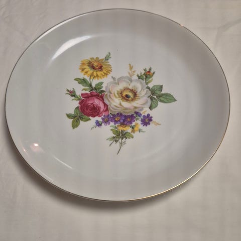 Fint gammelt serverings-sett bestående av ett stort fat (diameter 26 cm) og seks tilhørende asjetter (diameter 17 cm). Fem ulike dekormotiver på asjettene som vist på bildet. Stempel viser at det er Sanitærporselen, som ble produsert i perioden mellom 1948-1952 av Porsgrund porselen.