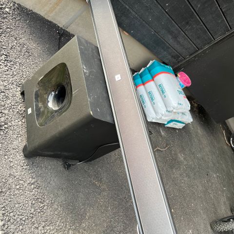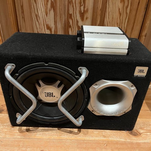 JBL Subwoofer høyttaler i svart farge. Designet for å gi dyp bassgjengivelse som en del av lydanlegg. Kan brukes i hjemmekino- eller musikkoppsett for forbedret lydopplevelse. Og jbl lydplanke
