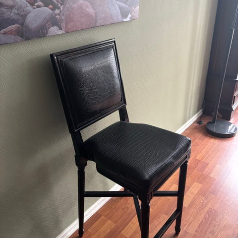 Selger fire flotte stoler i god kvalitet. Sannsynligvis utført i bok. Stål-ben bak med beskyttelse mot gulv.