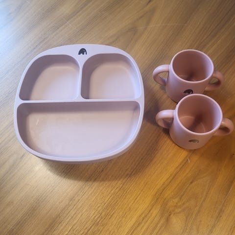 Meget pent brukte tutekopper i silikon fra Liewood. Selger to stykk kopper i fargene grå og gul.