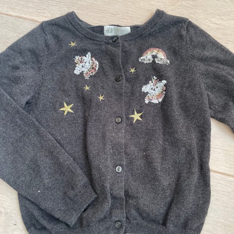 Grå strikkegardigan med nydelig diamanter (ikke ekte) som en krage eller bord langs halsen/ kragen. Søte knapper.