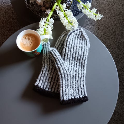 Ene røde paret har jeg også strikket med følgetråd med små paljetter