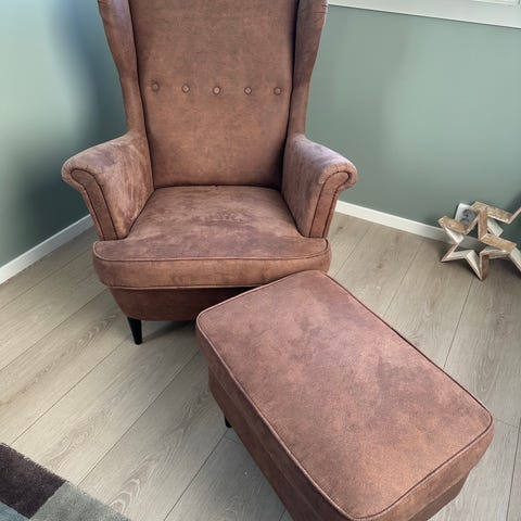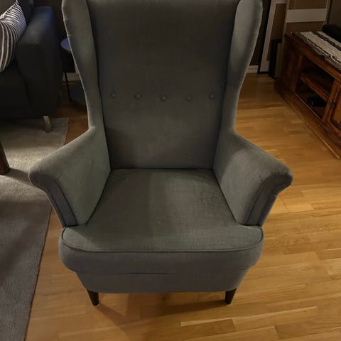 Strandmoen mørk blå velour stol. Selges ikke lenger hos ikea. Utrolig lite brukt