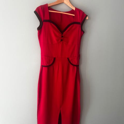 Veldig kul småblomstret kjole med røde knapper.