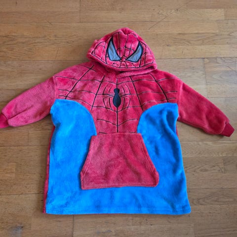 Spiderman hoodie/morgenkåpe i fleece, str 104-116. Har blitt pent og lite brukt, men har noen små nupper ytterst på ermene, se bilder.