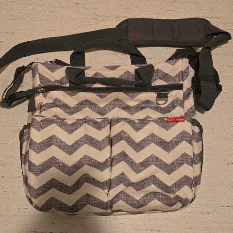Skip Hop Duo Signature stelleveske i grå farge. Vesken har flere lommer og rom for organisering av babyutstyr. Den har skulderrem for bæring og er laget i slitesterkt materiale.