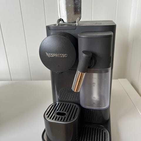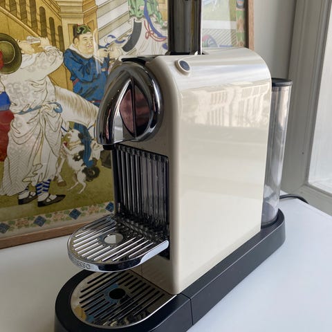 Hel og pen kremhvit Nespresso Maestria selges billig. Den lekker når man lager kaffe. Antakelig er det pakningen som tetter rundt kapselen som er blitt gammel og sprø. Jeg gidder ikke å bruke tid på å fikse det, så selger den billig som reparasjonsobjekt eller delemaskin.