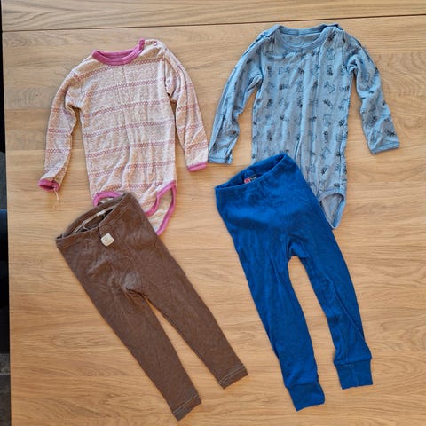 To ullsett brukt av ett barn selges, vært perfekte til bruk i barnehagen. Begge settene har liten anmerkning/et lite hull på buksen, bodyer er uten anmerkning og hull.