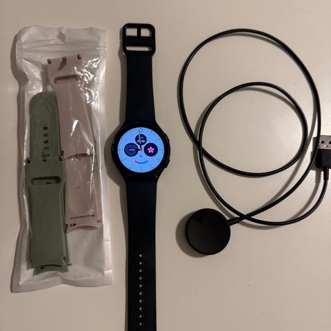 Samsung Galaxy Watch 4 smartklokke i svart farge. 46mm. Leveres med original emballasje og tilbehør. Passer til bruk som aktivitetsmåler og smartklokke.