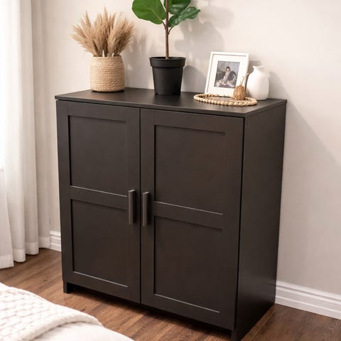 Skap i tre med glassdør og hyller