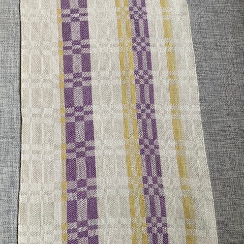 En fantastisk og herlig duk i varme fargetoner, som jeg antar stammer fra 1970-tallet. Stoffet ser ut som vevet ull, kjennes som ull og har ull-lukt, men jeg kan ikke si 100 % sikkert.