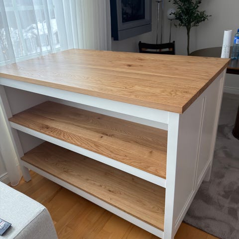Pent brukt kjøkkenøy Tornviken fra IKEA med to barstoler.