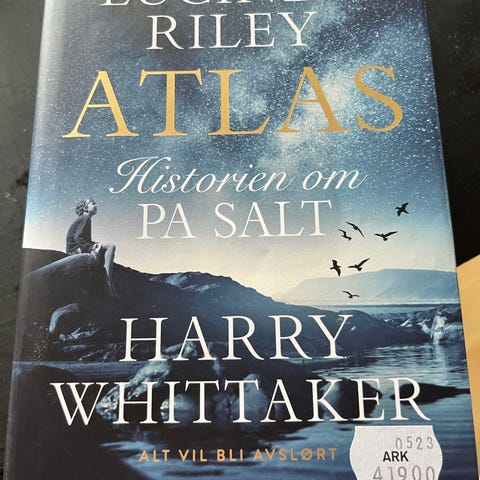 Lucinda Riley Atlas roman. Innbundet bok med blått omslag. Historien om Pa Salt