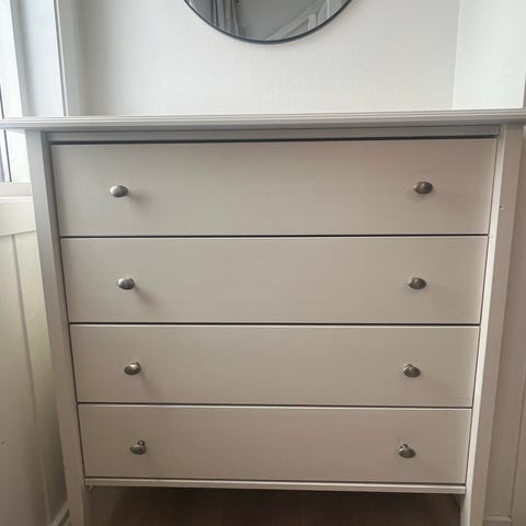 Kan brukes som sjenk, kommode eller tv-benk. 2 skuffer og 5 hyller. Skuffene er litt "trege" men med litt smøring tror jeg de blir i orden? Baksiden er ikke helt spikret fast, men det kan lett ordnes eller man kan ha åpning for eventuelle ledninger.
