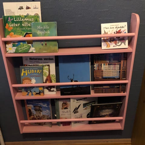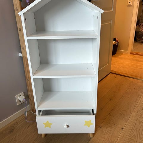 Søt bokhylle med oppbevaringsskuff selges. Pent, men «godt» brukt. Er noen små bruksmerker ettersom den har stått på et barnerom - se bilder.