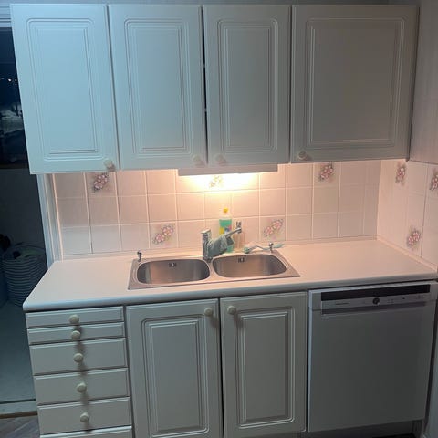 Kjøkkeninnredning med hvite overskap og underskap, lys benkeplate, oppvaskkum og komfyr med stekeovn. Skapene har profilerte dører. Flere skuffer og hyller for oppbevaring. Passer til standard kjøkkenløsninger. Se mål på bilder. Må demonteres og fraktes bort av kjøper.
