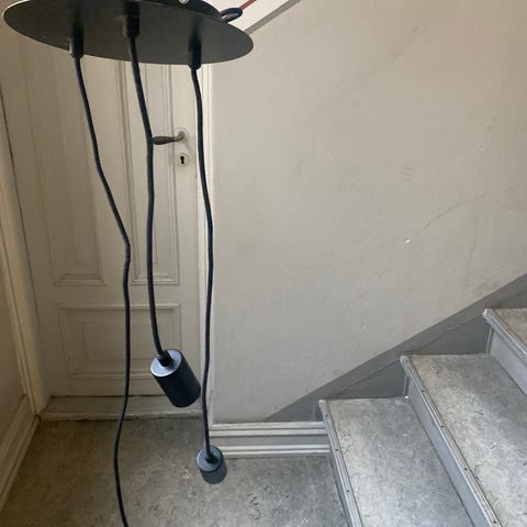 Taklampe med fem hengende lyspærer i forskjellige høyder. Base og sokler i svart metall. Monteres med takbøyle. Tekstilkledde, 1,5 m lange svarte ledninger. Lengden på hver ledning kan justeres: Det er trekkavlaster på hver ledning som kan skrus opp. Deretter kan man «mate" opp så mye ledning som ønskes for å oppnå riktig lengde og deretter skrus avlasteren til igjen. For fast installasjon. Maks 5x60W. E27-sokkel (lyspærer ikke inkludert).