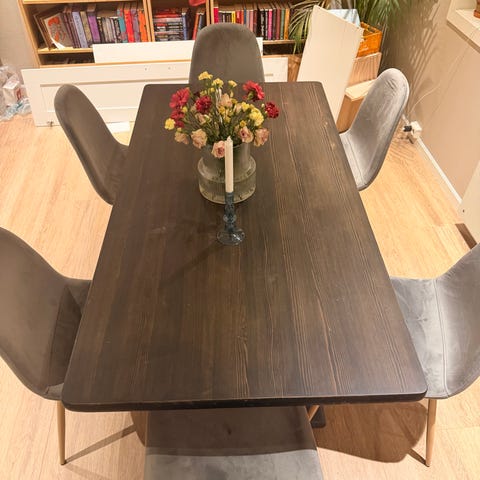 Solid og praktisk bord selges. Bordplaten er 120 cm lang og 80 cm bred, med en varm treutførelse som passer godt som skrivebord, kjøkkenbord eller arbeidsbord.