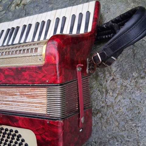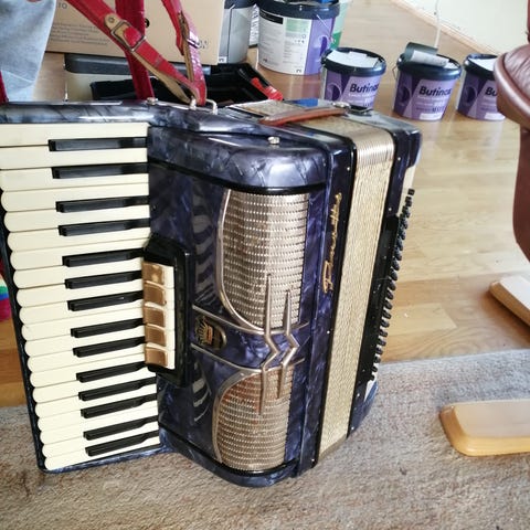 Gammel trekkspillkasse følger med.