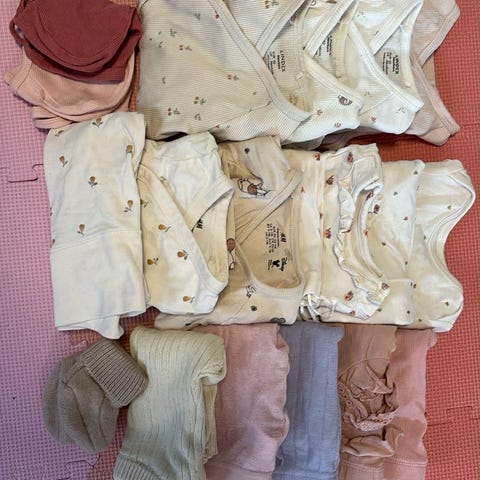 Klespakke til jente baby str 50-56. Helt nye ubrukte klær som kun er vasket. Ble for lite for den lange jenta vår. Det meste er Carters bukser, bodyer og natt drakt i bomullsblanding, sparkedress i fleece, en pysj fra H&M i bomull og én Nameit pysj drakt m fot i merinoull m bambus inni.