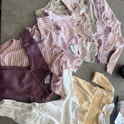 Klespakke til jente baby str 50-56. Helt nye ubrukte klær som kun er vasket. Ble for lite for den lange jenta vår. Det meste er Carters bukser, bodyer og natt drakt i bomullsblanding, sparkedress i fleece, en pysj fra H&M i bomull. én Nameit pysj drakt m fot i merinoull m bambus inni er solgt.