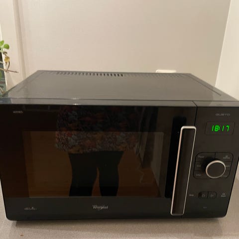 Whirlpool mikrobølgeovn i svart farge. Passer til oppvarming og tilberedning av mat. Kompakt design for enkel plassering på kjøkkenbenken.
