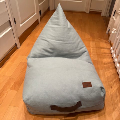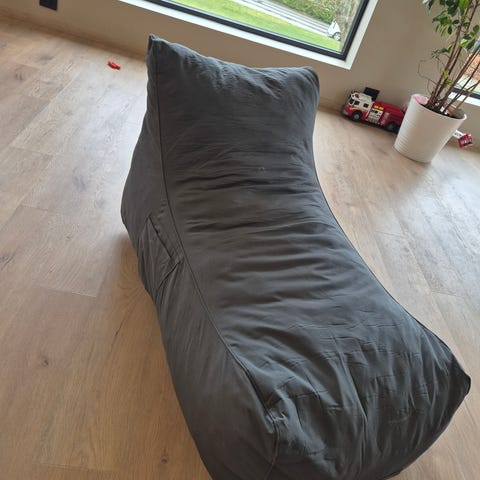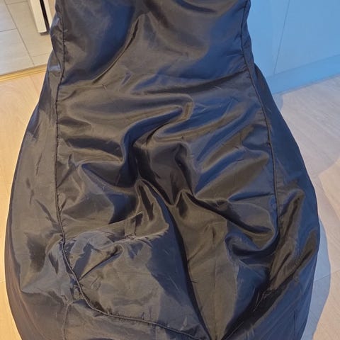 Kjøpt ny for ca 3 år siden, godt brukt av ett barn. Super å ha i tv-stje eller på barnerom. Det er et par mindre ikke veldige synlige flekker på den, ellers er stoffet slitesterkt og har ingen spesiell slitasje. På undersiden av sakkosekken er det revnet ca 15 cm i sømmen (se bilde), men dette synes ikke når den står på gulvet.
