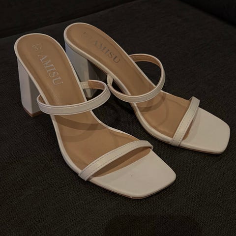H&M hæler i størrelse 40 med beige farge. Skoene har en åpen tådesign og to brede stropper over foten. Hælene er høye og firkantede, og skoene har en glatt overflate.