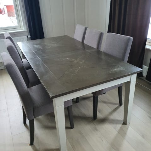 Brukt spisestue bord med 4 brukte stoler selges. Er bruksmerker på både bord og stoler. Veldig tungt bord. Må hentes. Kommer fra røykfritt hjem, men har katter.