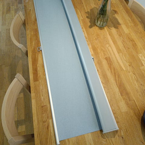 190 cm høy. 144 cm bred inkludert feste. Selve gardinen er 138,5 cm bred. Hentes på Uleira.