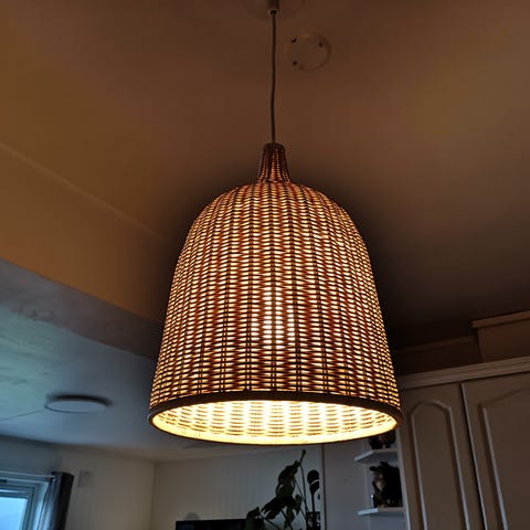 Eldre taklampe i tre og tekstil