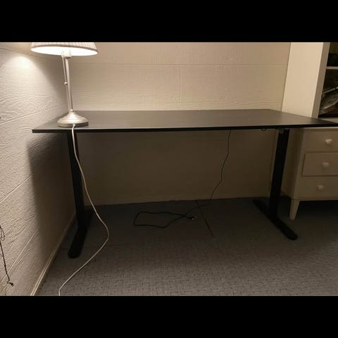 Justerbar høyde, kan bli 85cm høy. Det følger med kabelnett under bordplaten.