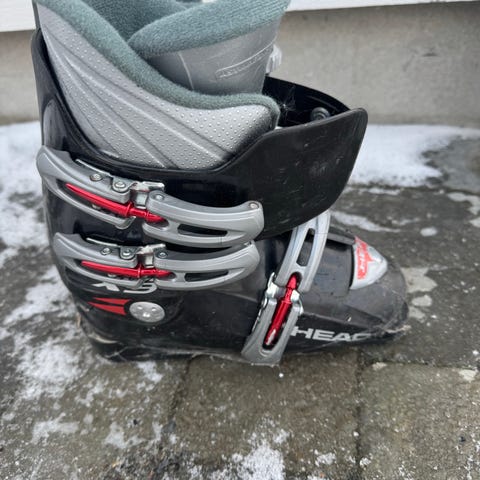 Head skistøvler i størrelse 260 med farger i hvitt og grønt. Støvlene har tre spenner for justering.
