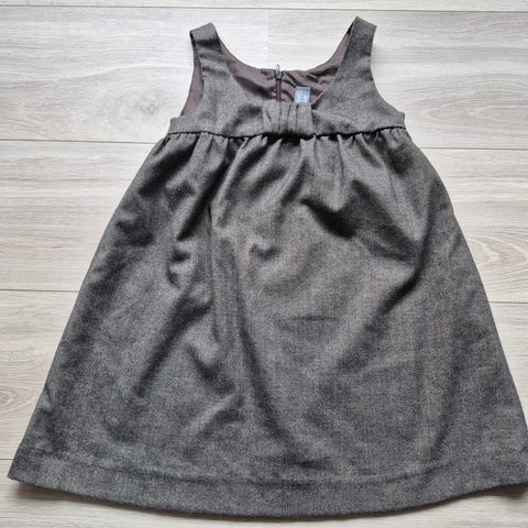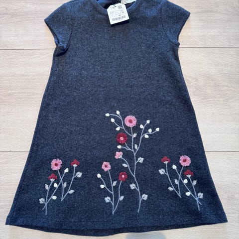 Fin kjole/lang genser i størrelse 116 for jenter. Kjolen er grå og laget av ullmateriale. (?) Den har korte ermer og broderte blomsterdetaljer på forsiden.
